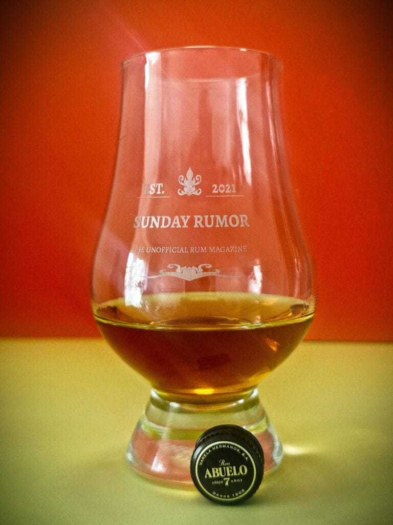 In the glass, Ron Abuelo Añejo 7 shows a clear, amber tone — lighter than expected given the bottle’s darker hue. From the very first pour, it challenges expectations.
